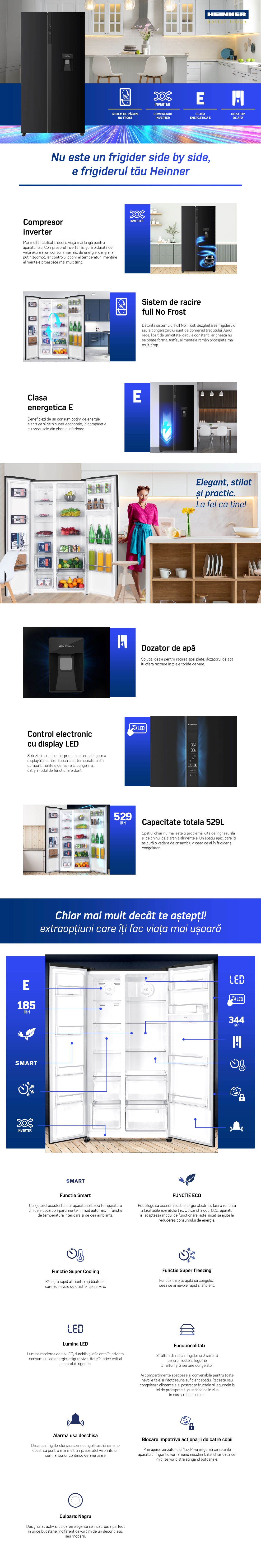 Side by side Heinner HSBS-HM529NFBKWDE++, Full No frost, compresor Inverter, dozator de apa, clasa energetica: E, display LED cu control touch, capacitate totala: 529L, capacitate frigider: 344L, capacitate congelator: 185L, lumina LED, functie Smart, functie ECO, Super Cooling, Super Freezing, alarma usa deschisa, blocare acces copii, 3 rafturi din sticla frigider, 2 compartimente pentru fructe si legume, 3 rafturi congelator, 2 sertare congelator, capacitate rezervor apa: 2.5L, dimensiuni (WxDxH): 90 x 66 x 177 cm, culoare: Negru