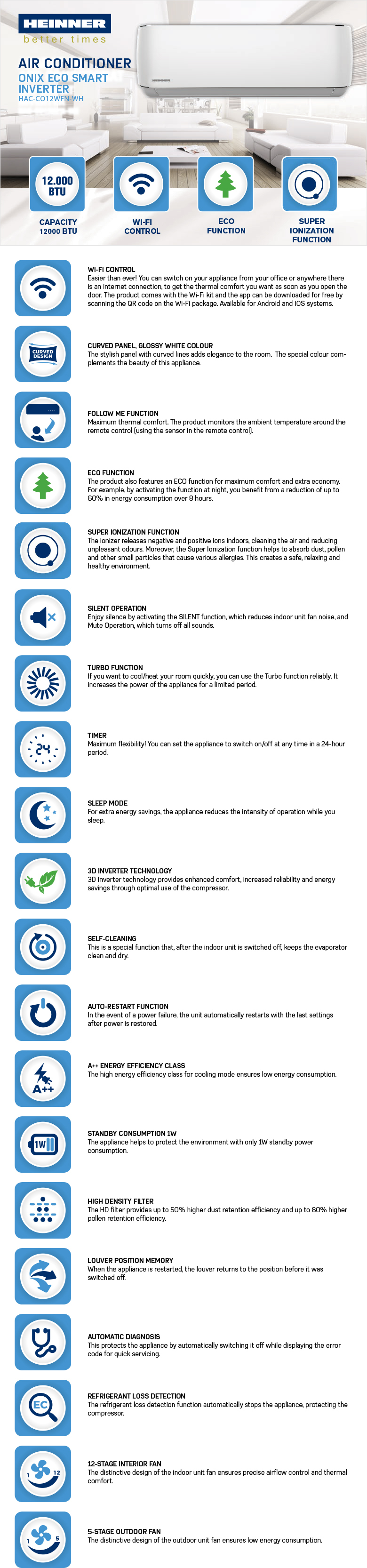 Aparat de aer conditionat Heinner Onix Eco HAC-CO12WFN-WH, Smart inverter, capacitate 12000BTU, clasa energetica racire A++, clasa energetica incalzire A+, control WIFI, Functie Super Ionizare, functie ECO, Functie “Follow me”, Functie Turbo, Functie Sleep, Timer, filtru cu densitate ridicata, auto- restart, diagnosticare automata, detectare pierdere agent frigorific, consum in stand-by 1W, Culoare: Alb.