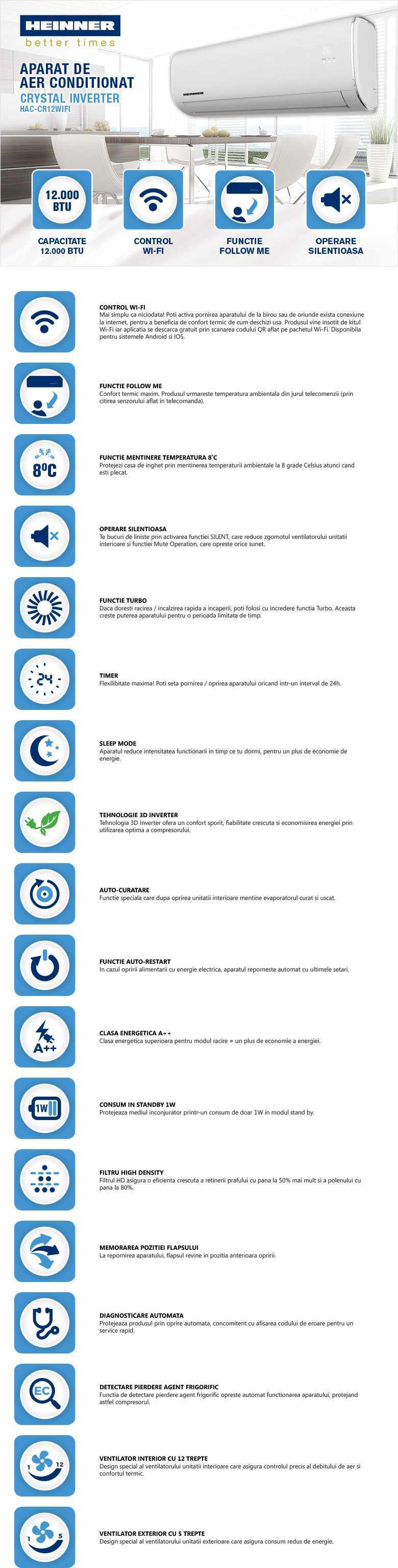 Aer conditionat Crystal Heinner HAC-CR12WIFI, capacitate: 12000BTU, clasa energetica incalzire: A+, clasa energetica racire: A++, control WIFI, functie auto-restart, Sleep mode, Follow me, auto-curatare, functie Silence,mentinere temperatura 8 grade, functie detectare pierdere agent frigorific, alb