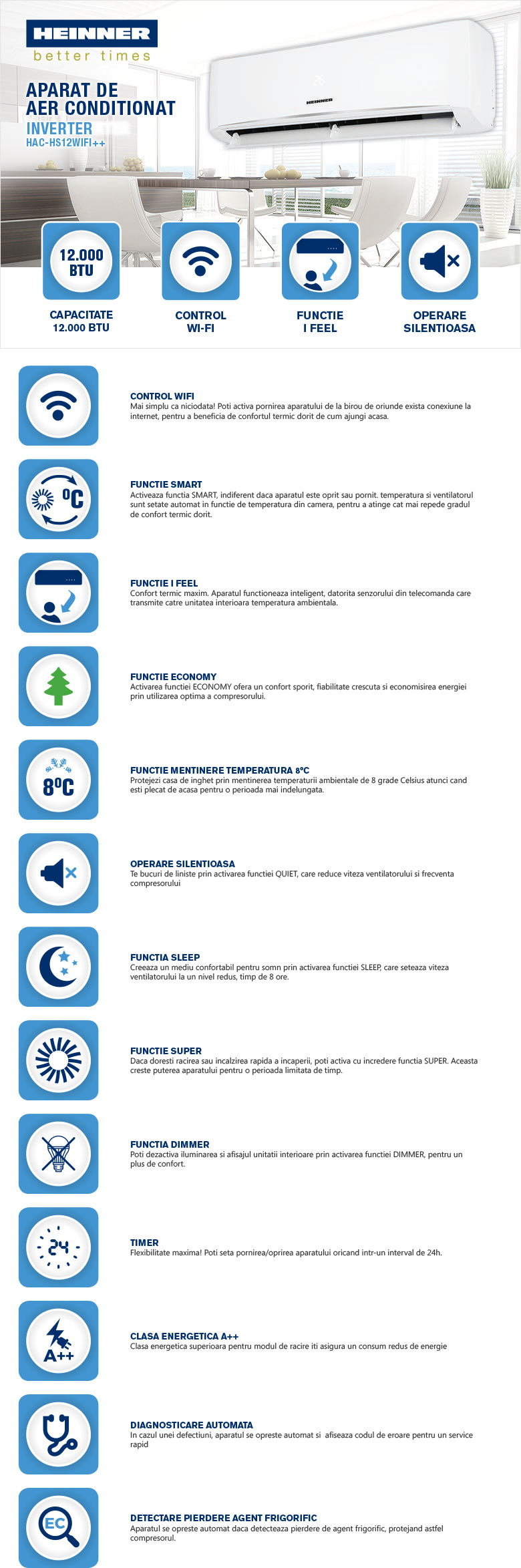 Aparat de aer conditionat Heinner HAC-HS12WIFI++, capacitate: 12000 BTU, clasa energetica racire: A++, clasa energetica incalzire: A+, control WIFI, functie mentinere temperatura 8°C, functie SLEEP, functie SMART, functie ECONOMY, timer 24h, auto restart, mod silentios