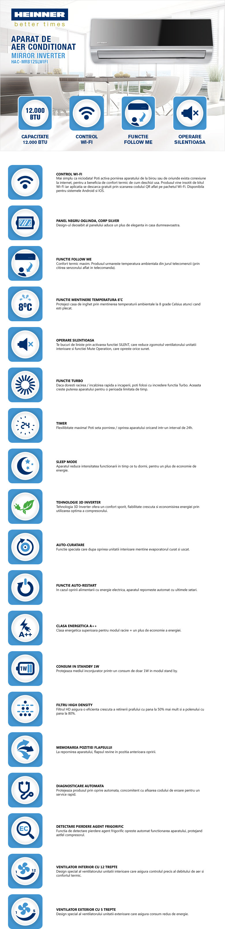 Aer conditionat Mirror Heinner HAC-MRB12SLWIFI, capacitate: 12000BTU, clasa energetica incalzire: A+, clasa energetica racire: A++, control WIFI, functie auto-restart, Sleep mode, Follow me, auto-curatare, functie Silence, mentinere temperatura 8 grade, functie detectare pierdere agent frigorific, panel negru oglinda, body silver