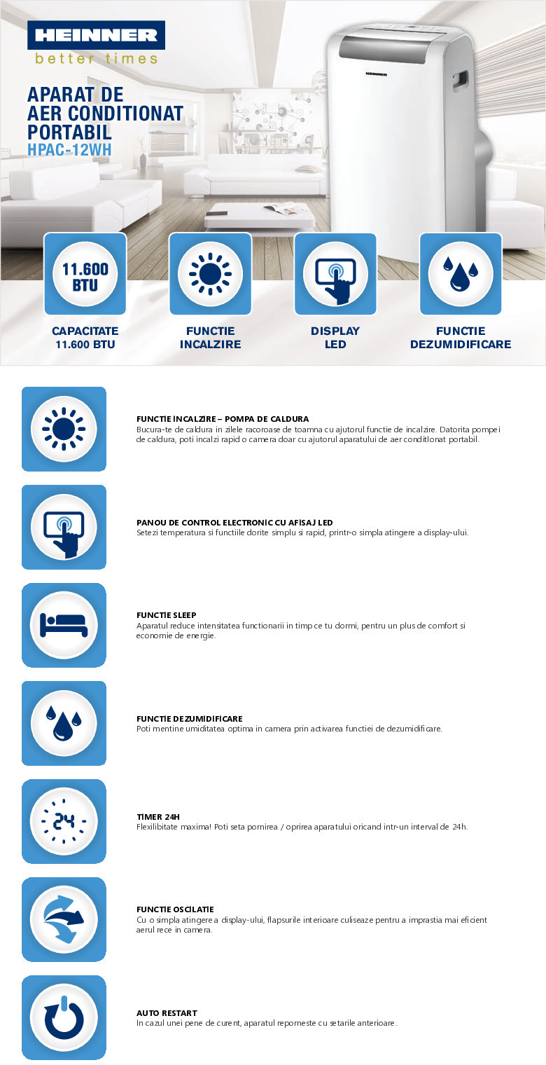 Aparat aer conditionat Heinner HPAC-12WH, capacitate: 12000BTU, clasa energetica racire: A, clasa energetica incalzire: A+, functie de incalzire - pompa de caldura, afisaj LED, telecomanda, timer - 24H, sleep mode, nivel de zgomot unitate interioara: 65dB, consum in stand- by: 0.5W, roti pentru deplasare facila, kit de instalare inclus.