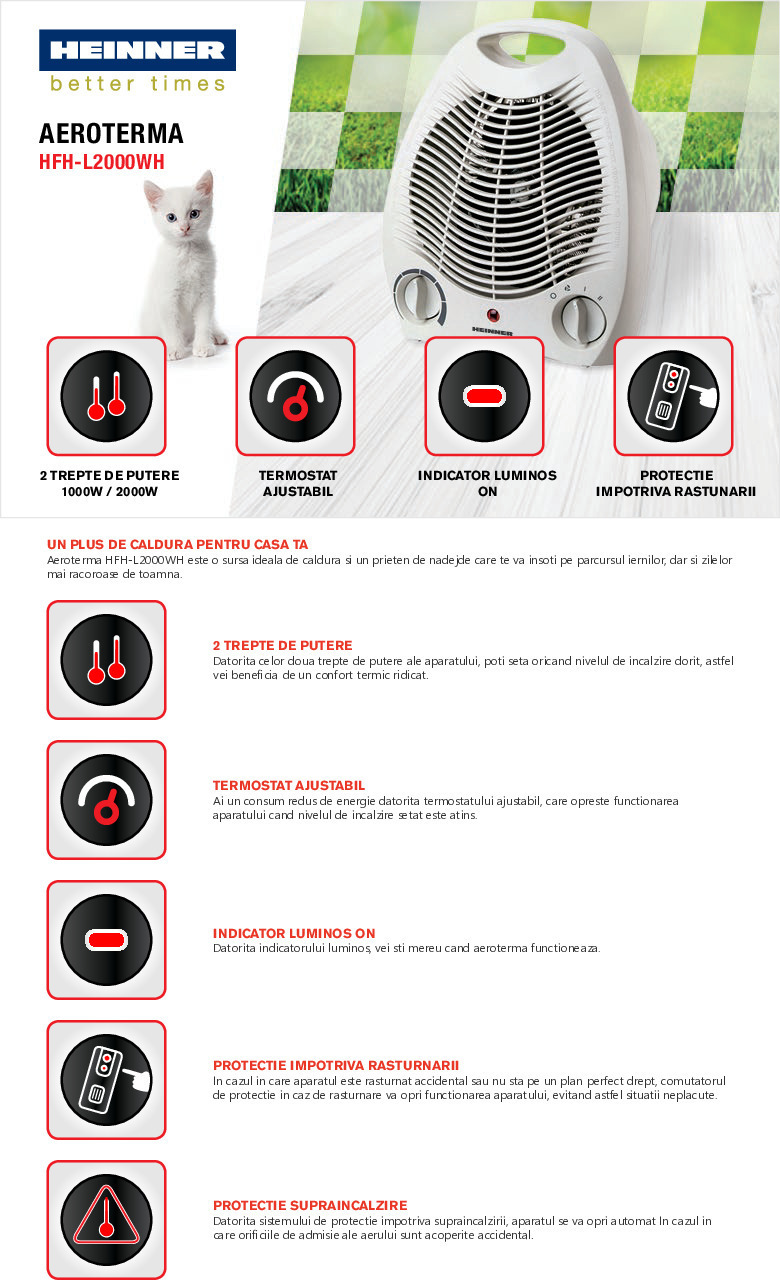 Aeroterma Heinner HFH-L2000WH, 2 trepte de putere: 1000/2000W, protectie supraincalzire, indicator luminos "ON", termostat ajustabil, protectie impotriva rasturnarii