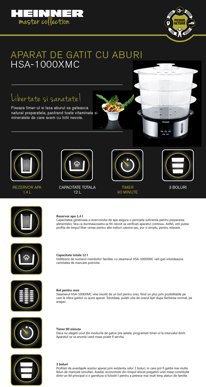 Aparat de gatit cu aburi Heinner HSA-1000XMC, putere: 1000W, rezervor apa: 1.4 l, capacitate totala: 12 l, 3 boluri, bol pentru orez, timer: 90 minute, semnal sonor finalizare program, protectie supra-incalzire, indicator nivel apa, functie oprire automata, picioruse anti-alunecare, loc depozitare cablu de alimentare, decoratii inox