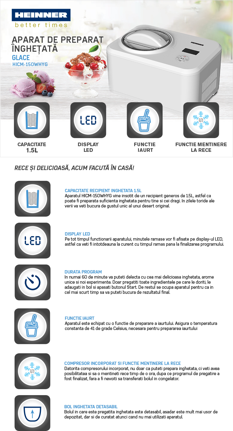 APARAT DE INGHETATA HEINNER GLACE HICM-150WHYG, CAPACITATE BOL 1.5L, COMPRESOR INCORPORAT, DISPLAY LED, TIMER, FUNCTIE MENTINERE LA RECE, FUNCTIE IAURT, BOL INGHETATA DETASABIL, PUTERE 120W, DIMENSIUNI (LXAXI): 38X27X24.2 CM, CULOARE: ALB