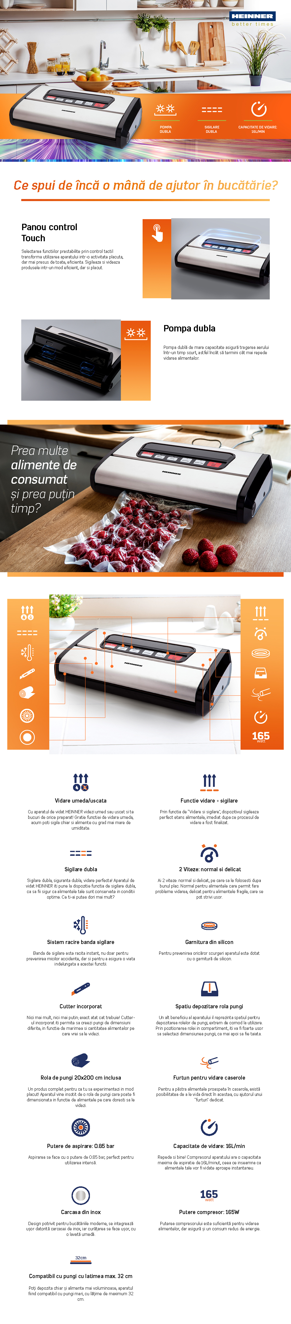 Aparat de vidat si sigilat Heinner HAV-165BKSS, vidare si sigilare , vidare uscata/umeda, functie sigilare , pompa dubla , sigilare dubla , control Touch , doua moduri: normal/delicat , functie Pulse , sistem racire banda sigilare , garnitura silicon , rola pungi inclusa 20x200 cm , furtun pentru caserole , cutter incorporat, spatiu depozitare rola pungi , compatibil cu pungi latime 32 cm , capacitate vidare: 16L/min , presiune: -0.85 bar , putere: 165W , carcasa inox