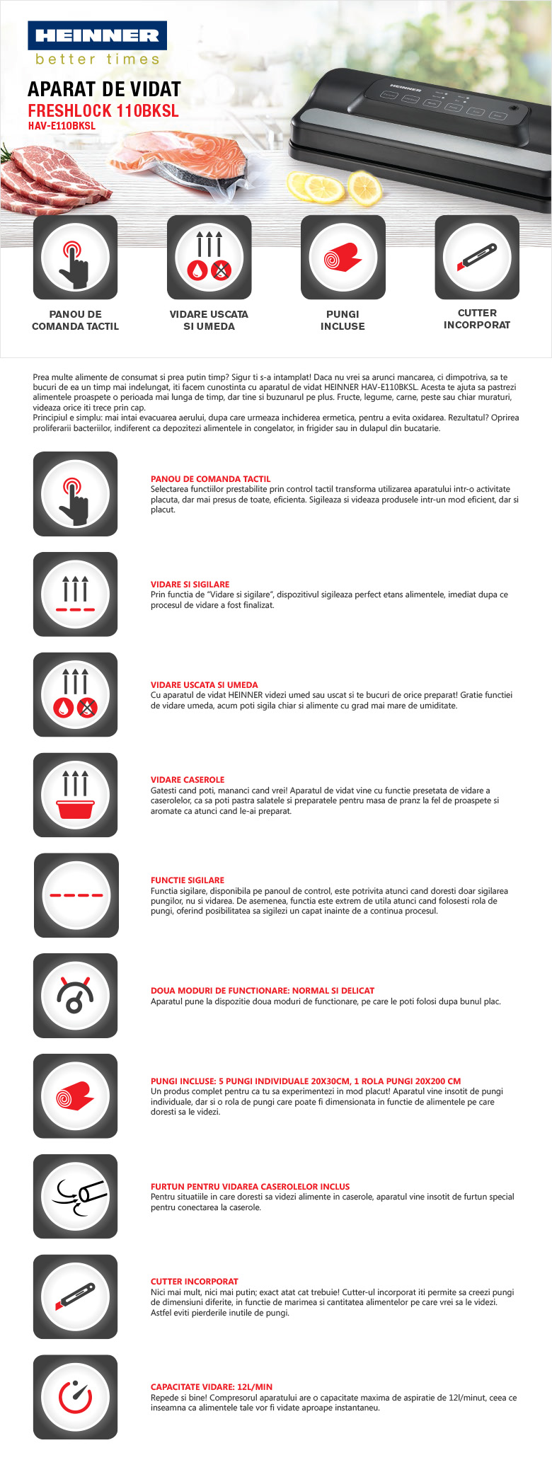 Aparat de vidat Heinner HAV-E110BKSL, vidare si sigilare, vidare uscata si umeda, functie sigilare, vidare caserole, control Touch, doua moduri: nromal/delicat, rola pungi 20x200mm inclusa, 5 pungi individuale 20x30 cm incluse, furtun pentru vidare caserole, cutter incorporat, comptaibil cu pungi latime max 30cm, capacitate vidare: 12L/min, presiune max: 80kpa, putere: 110W, negru cu decoratiune silver