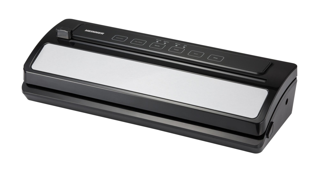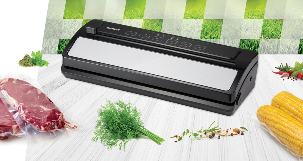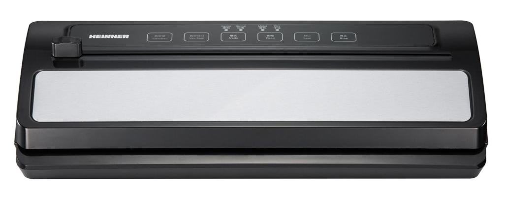 Aparat de vidat Heinner HAV-E110SS, vidare si sigilare, vidare uscata si umeda, functie sigilare, vidare caserole, control Touch, doua moduri: normal/delicat, rola pungi 20x200mm inclusa, 5 pungi individuale 20x30cm incluse, furtun pentru caserole, cutter incorporat, compatibl cu pungi latime 30cm, capacitate vidare: 10L/min, presiune: 80kpa, putere: 110W, negru cu decoratiune silver