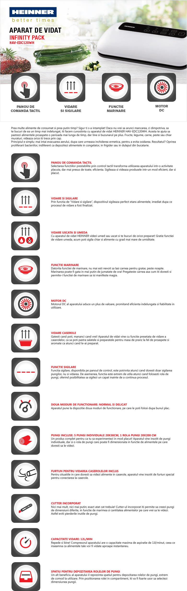 Aparat de vidat Heinner HAV-EDC120WH, vidare si sigilare, vidare uscata si umeda, functie sigilare, vidare caserole, functie marinare, motor dc, control Touch, doua moduri: normal/delicat, rola pungi 20x200mm inclusa, 5 pungi individuale 20x30cm incluse, furtun pentru caserole, cutter incorporat, spatiu depozitare rola pungi, compatibil cu pungi latime 28cm, capacitate vidare: 12L/min, presiune: 80kpa, putere: 120W, alb