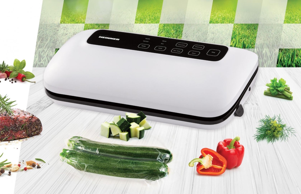 Aparat de vidat Heinner HAV-EDC120WH, vidare si sigilare, vidare uscata si umeda, functie sigilare, vidare caserole, functie marinare, motor dc, control Touch, doua moduri: normal/delicat, rola pungi 20x200mm inclusa, 5 pungi individuale 20x30cm incluse, furtun pentru caserole, cutter incorporat, spatiu depozitare rola pungi, compatibil cu pungi latime 28cm, capacitate vidare: 12L/min, presiune: 80kpa, putere: 120W, alb