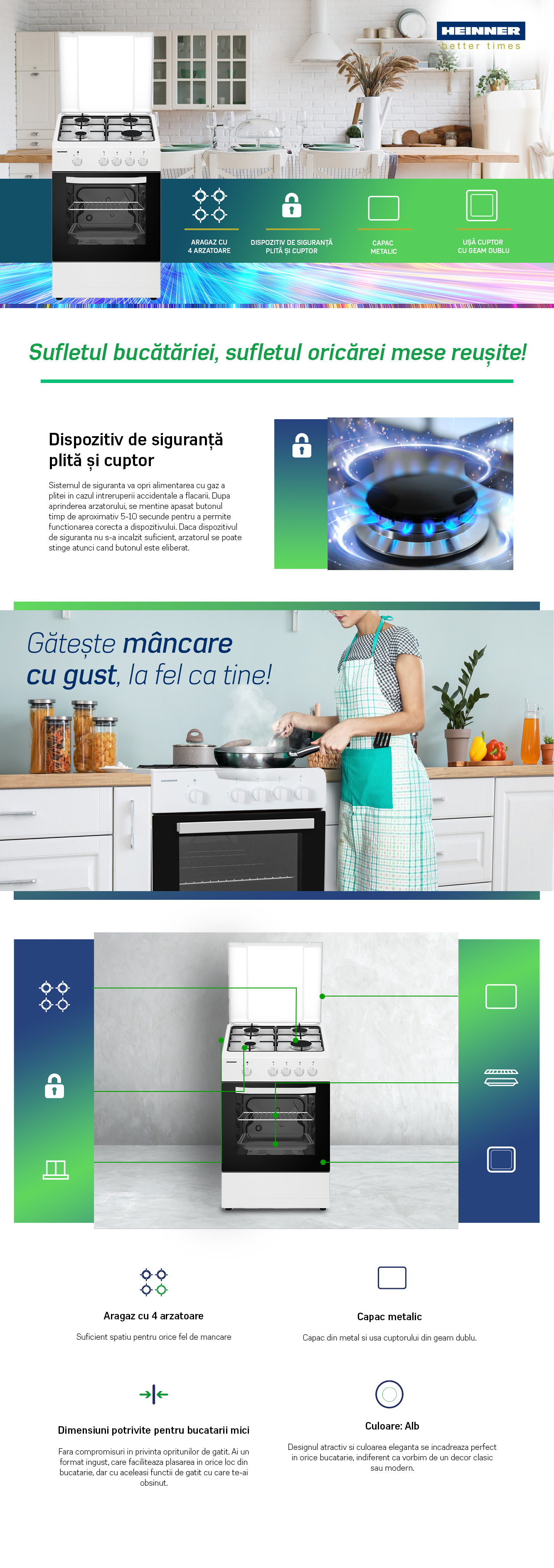 ARAGAZ GAZ HEINNER HFSC-SME50WH, 50X50CM, 4 ARZATOARE, SUPORT EMAIL, CAPAC METALIC, DISPOZITIV DE SIGURANTA PLITA SI CUPTOR, USA CUPTOR CU GEAM DUBLU, DUZE GPL INCLUSE, TAVA SI GRATAR CROMAT, CULOARE: ALB