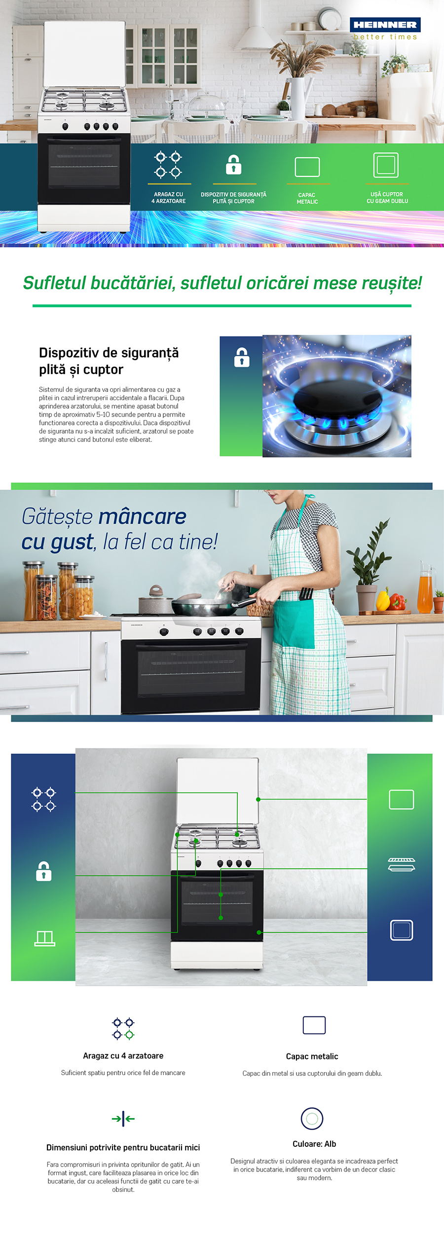 ARAGAZ GAZ HEINNER HFSC-SME60WH, 60x55CM, 4 ARZATOARE, SUPORT EMAIL, CAPAC METALIC, DISPOZITIV DE SIGURANTA PLITA SI CUPTOR, USA CUPTOR CU GEAM DUBLU, DUZE GPL INCLUSE, TAVA SI GRATAR CROMAT, CULOARE: ALB