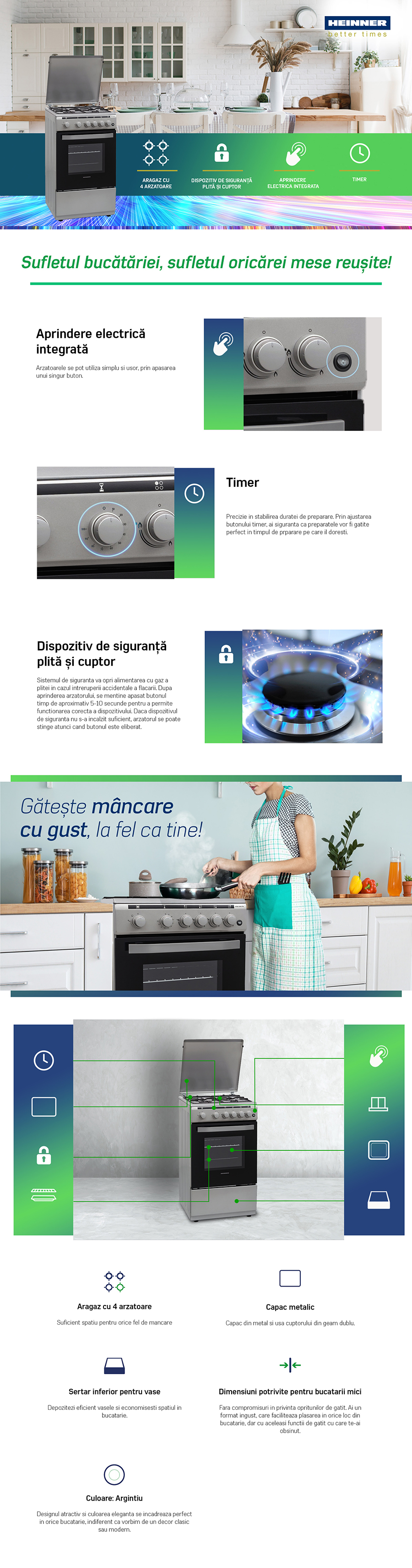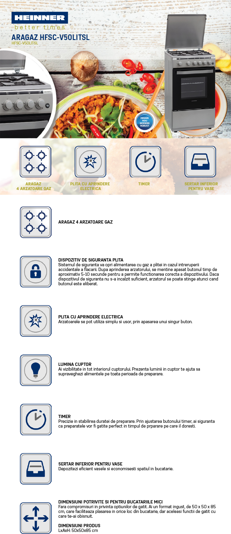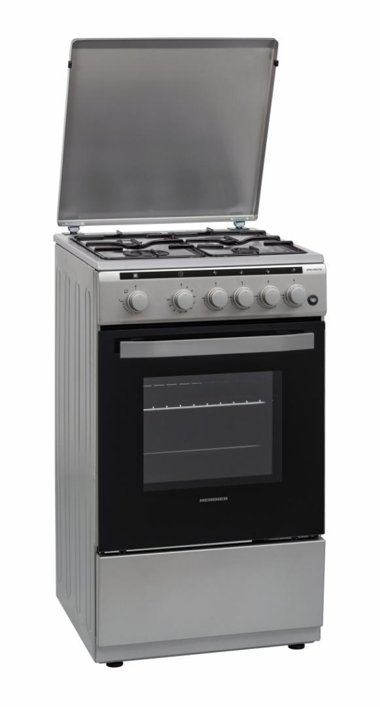 Aragaz Gaz Heinner HFSC-V50LITSL, 50x50cm, 4 arzatoare, Suport email, Capac metalic, Aprindere electrica plita si cuptor, Dispozitiv de siguranta plita si cuptor, Timer, Lumina cuptor, Usa cuptor cu geam dublu detasabil, Duze GPL incluse, Tava si gratar cromat, Dimensiuni ( LxAxI): 50x50x85 cm, Culoare: Argintiu