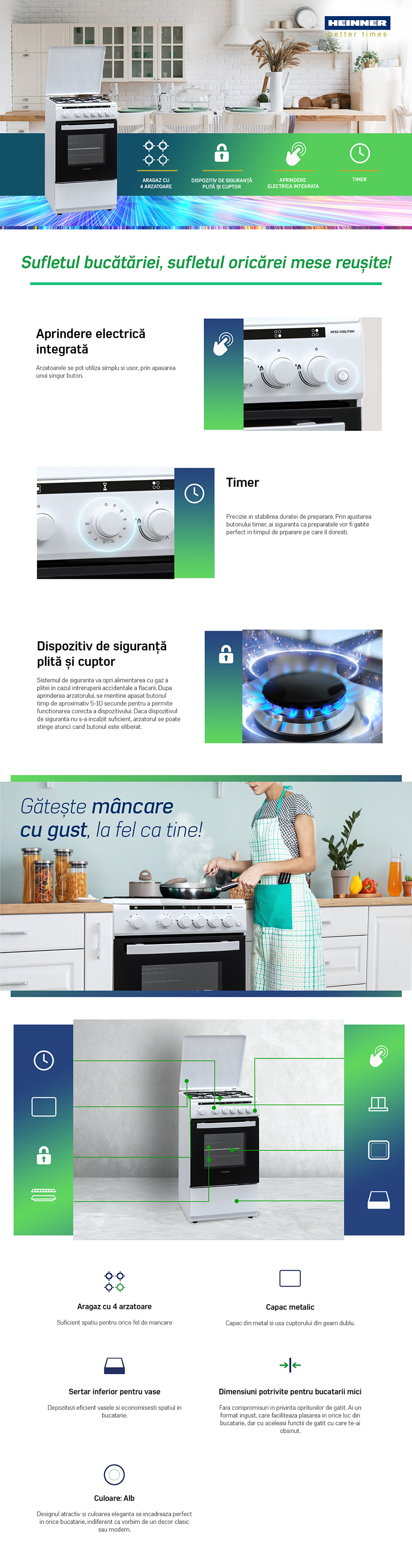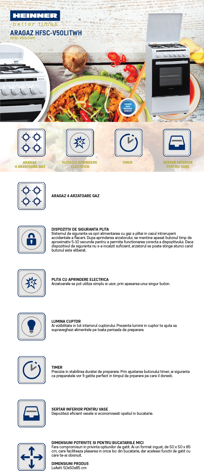 Aragaz Gaz Heinner HFSC-V50LITWH, 50x50cm, 4 arzatoare, Suport email, Capac metalic, Aprindere electrica plita si cuptor, Dispozitiv de siguranta plita si cuptor, Timer, Lumina cuptor, Usa cuptor cu geam dublu detasabil, Duze GPL incluse, Tava si gratar cromat, Dimensiuni ( LxAxI): 50x50x85 cm, Culoare: Alb