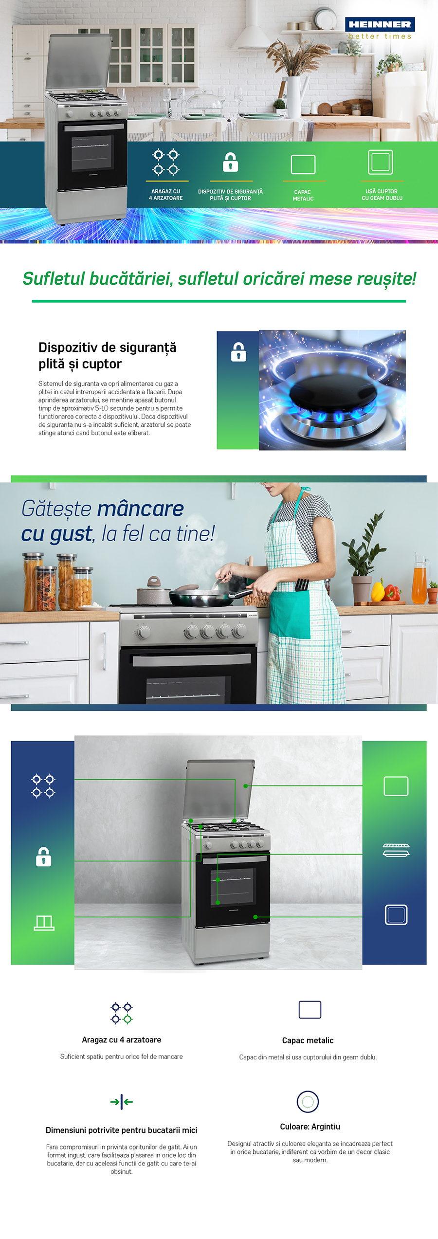 Aragaz Gaz Heinner HFSC-V50SL, 50x50cm, 4 arzatoare gaz, Suport email, Capac metalic, Dispozitiv de siguranta plita si cuptor, Usa cuptor cu geam dublu, Duze GPL incluse, Tava si gratar cromat, Dimensiuni ( LxAxI): 50x49.5x85 cm, Culoare: Argintiu