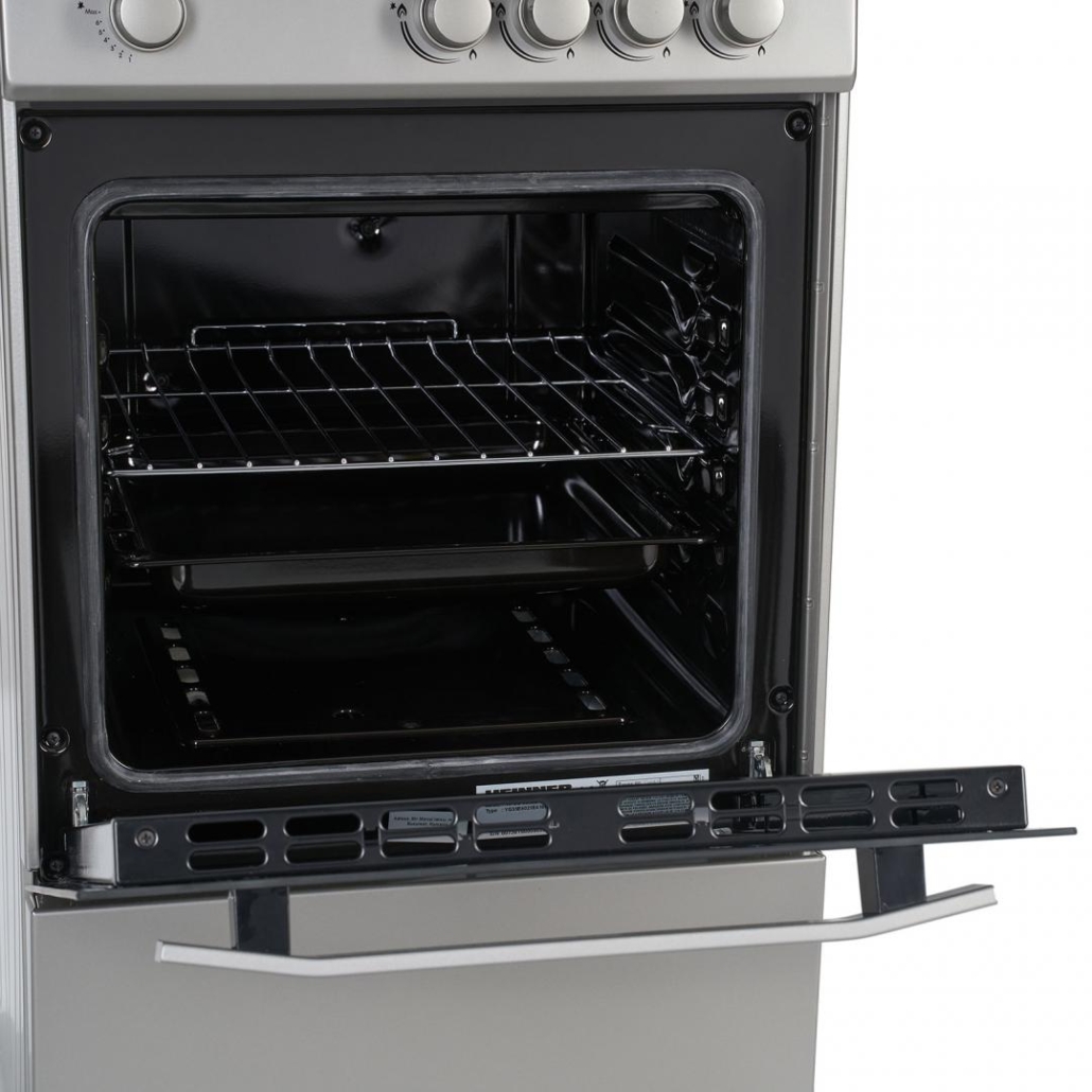 Aragaz Gaz Heinner HFSC-V50SL, 50x50cm, 4 arzatoare gaz, Suport email, Capac metalic, Dispozitiv de siguranta plita si cuptor, Usa cuptor cu geam dublu, Duze GPL incluse, Tava si gratar cromat, Dimensiuni ( LxAxI): 50x49.5x85 cm, Culoare: Argintiu