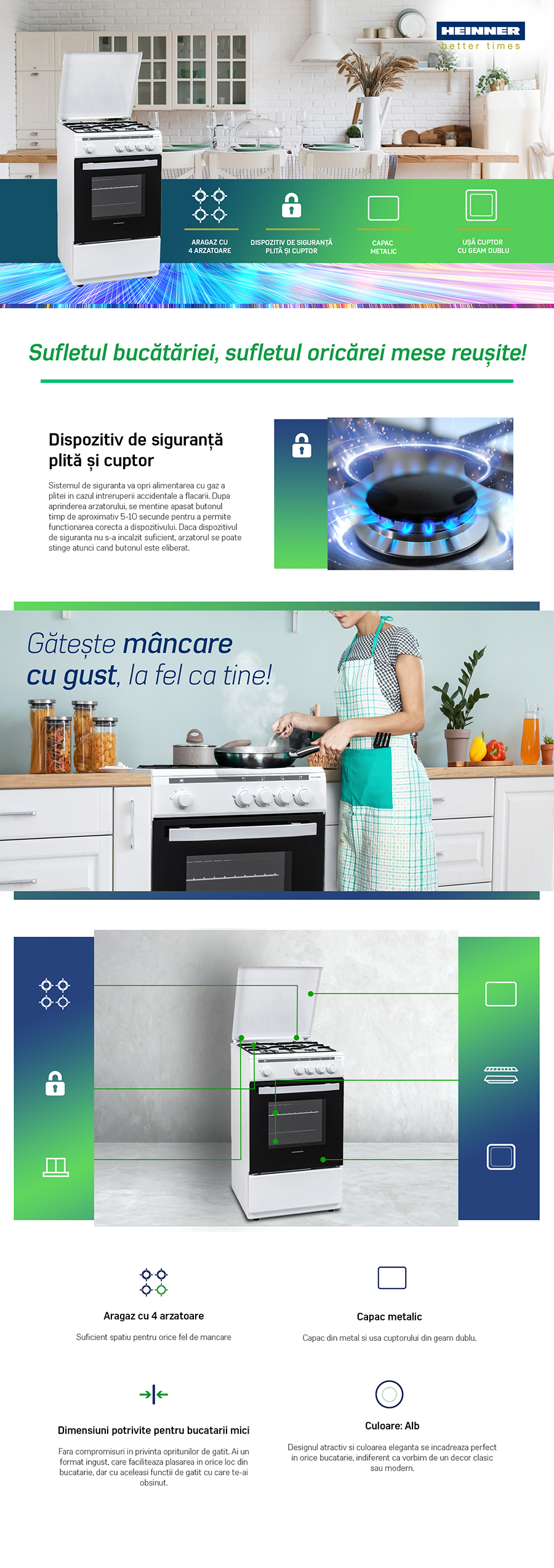 Aragaz Gaz Heinner HFSC-V50WH, 50x50cm, 4 arzatoare, Suport email, Capac metalic, Dispozitiv de siguranta plita si cuptor, Usa cuptor cu geam dublu, Duze GPL incluse, Tava si gratar cromat, Dimensiuni ( LxAxI): 50x49.5x85 cm, Culoare: Alb
