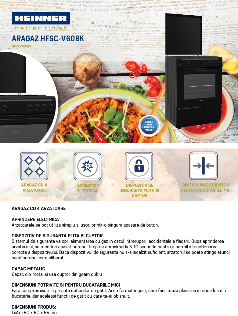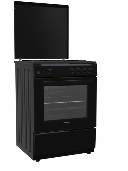 Aragaz Gaz Heinner HFSC-V60BK, 60x60cm, 4 arzatoare, Suport email, Capac metalic, Aprindere electrica plita, Dispozitiv de siguranta plita si cuptor, Usa cuptor cu geam dublu, Duze GPL incluse, Tava si gratar cromat, *Cablul electric nu este inclus, Dimensiuni ( LxAxI): 60x60x85 cm, Culoare: Negru