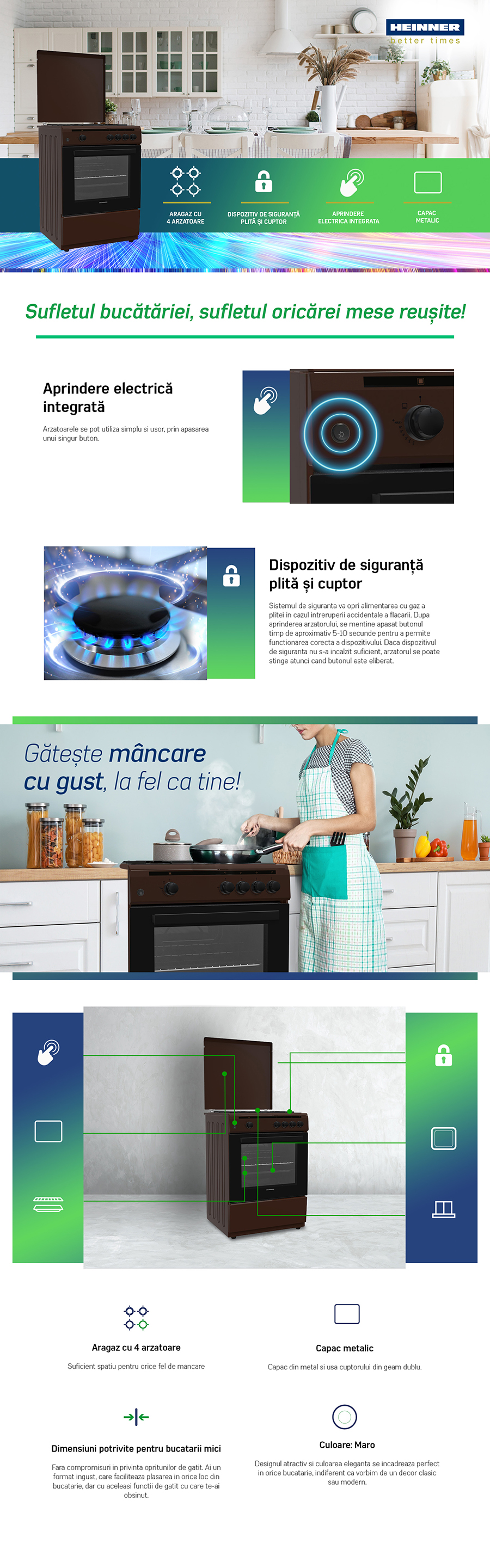 Aragaz Gaz Heinner HFSC-V60BRW, 60x60cm, 4 arzatoare, Suport email, Capac metalic, Aprindere electrica plita, Dispozitiv de siguranta plita si cuptor, Usa cuptor cu geam dublu, Duze GPL incluse, Tava si gratar cromat, *Cablul electric nu este inclus, Dimensiuni ( LxAxI): 60x60x85 cm, Culoare: Maro
