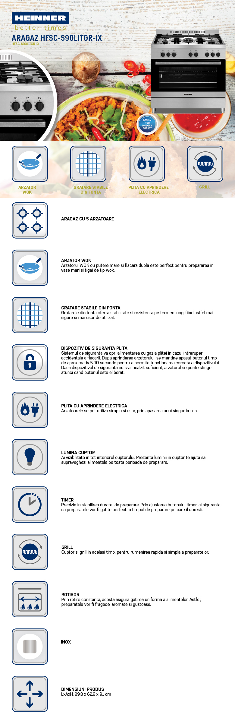 Aragaz Gaz semi-profesional Heinner HFSC-S90LITGR-IX, 90x60cm, 5 arzatoare, Wok, Suport fonta, Aprindere electrica plita si cuptor, Dispozitiv de siguranta plita si cuptor, Timer, Grill, Rotisor, Lumina cuptor, Usa cuptor cu geam dublu detasabil, Duze GPL incluse, Tava si gratar cromat, Dimensiuni ( LxAxI): 89.8x62.8x91 cm, Culoare: Inox