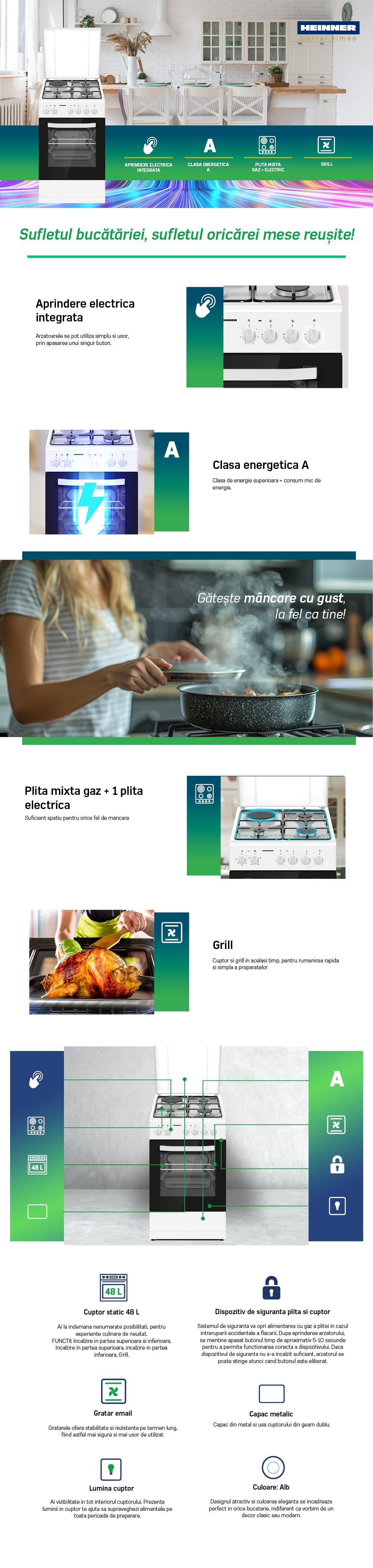 ARAGAZ MIXT HEINNER HFSC-S56E1HSWH, 50X60CM, 3 ARZATOARE GAZ + 1 PLITA ELECRICA, SUPORT EMAIL, CAPAC METALIC, APRINDERE ELECTRICA ARZATOARE, DISPOZITIV DE SIGURANTA ARZATOARE, CUPTOR ELECTRIC, CLASA A, 5 FUNCTII, GRILL, LUMINA CUPTOR, USA CUPTOR CU GEAM DUBLU DETASABIL, DUZE GPL INCLUSE, TAVA SI GRATAR CROMAT, DIMENSIUNI ( LXAXI): 50X60X86 CM, CULOARE: ALB