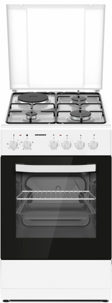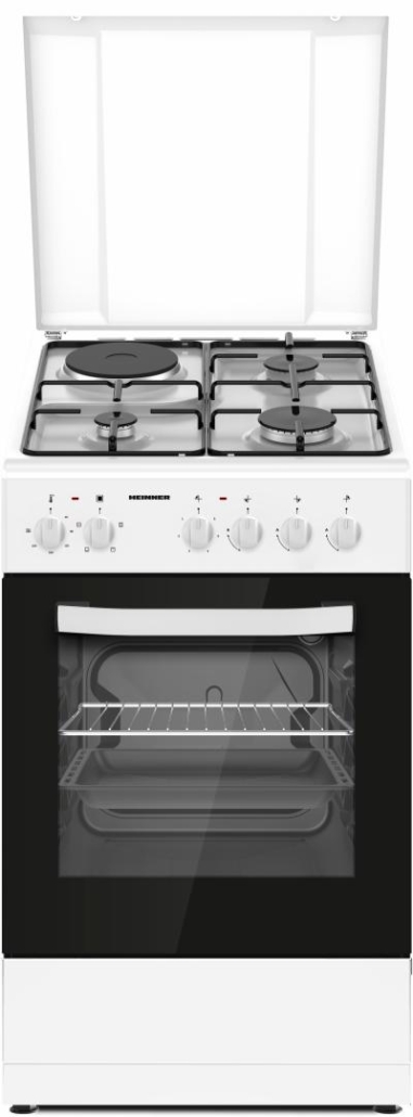 ARAGAZ MIXT HEINNER HFSC-S56E1HSWH, 50X60CM, 3 ARZATOARE GAZ + 1 PLITA ELECRICA, SUPORT EMAIL, CAPAC METALIC, APRINDERE ELECTRICA ARZATOARE, DISPOZITIV DE SIGURANTA ARZATOARE, CUPTOR ELECTRIC, CLASA A, 5 FUNCTII, GRILL, LUMINA CUPTOR, USA CUPTOR CU GEAM DUBLU DETASABIL, DUZE GPL INCLUSE, TAVA SI GRATAR CROMAT, DIMENSIUNI ( LXAXI): 50X60X86 CM, CULOARE: ALB
