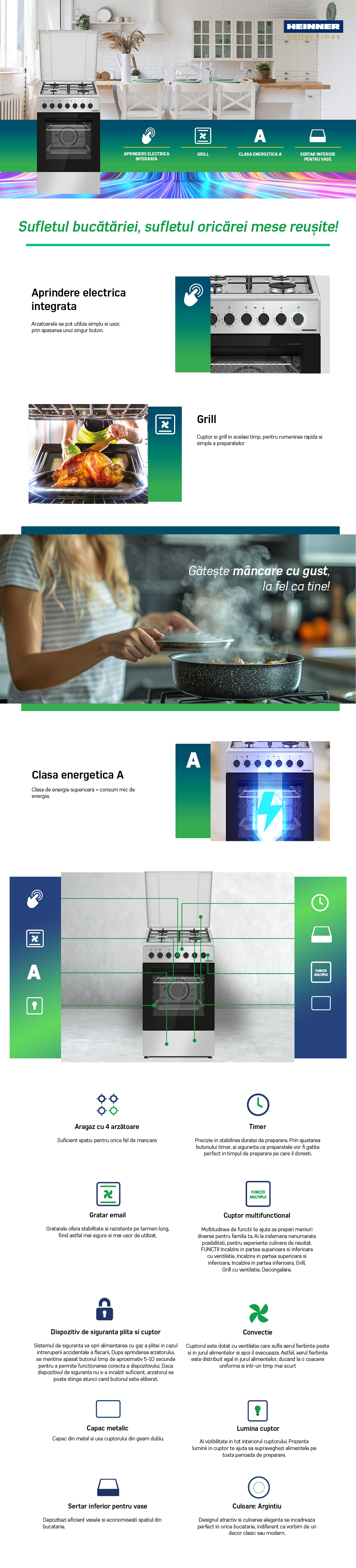 ARAGAZ MIXT HEINNER HFSC-S60LITGC-SL, 50X60CM, 4 ARZATOARE, SUPORT EMAIL, CAPAC METALIC, APRINDERE ELECTRICA PLITA, DISPOZITIV DE SIGURANTA PLITA, CUPTOR ELECTRIC, CLASA A, 6 FUNCTII, TIMER, GRILL, VENTILATIE, LUMINA CUPTOR, USA CUPTOR CU GEAM DUBLU DETASABIL, SERTAR INFERIOR VASE, DUZE GPL INCLUSE, TAVA SI GRATAR CROMAT, DIMENSIUNI ( LXAXI): 50x60x86 CM, CULOARE: ARGINTIU