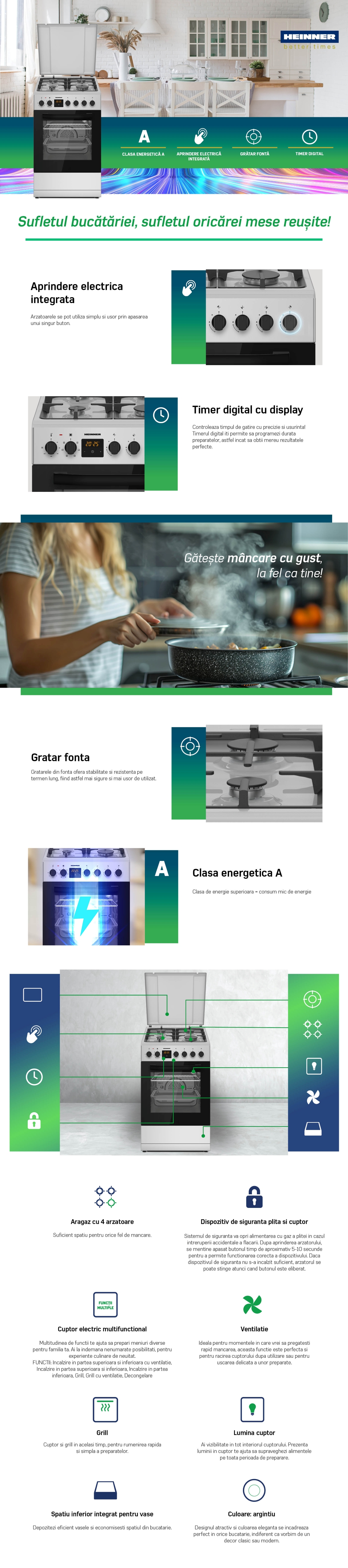 ARAGAZ MIXT HEINNER HFSC-S65MIXFD-SL, 50X60CM, 4 ARZATOARE, TIMER DIGITAL, SUPORT FONTA, CAPAC METALIC, APRINDERE ELECTRICA PLITA, DISPOZITIV DE SIGURANTA PLITA, CUPTOR ELECTRIC, CLASA A, 6 FUNCTII, TIMER, GRILL, VENTILATIE, LUMINA CUPTOR, USA CUPTOR CU GEAM DUBLU DETASABIL, SERTAR INFERIOR VASE, DUZE GPL INCLUSE, TAVA SI GRATAR CROMAT, DIMENSIUNI ( LXAXI): 49.8x61x86 CM, CULOARE: ARGINTIU