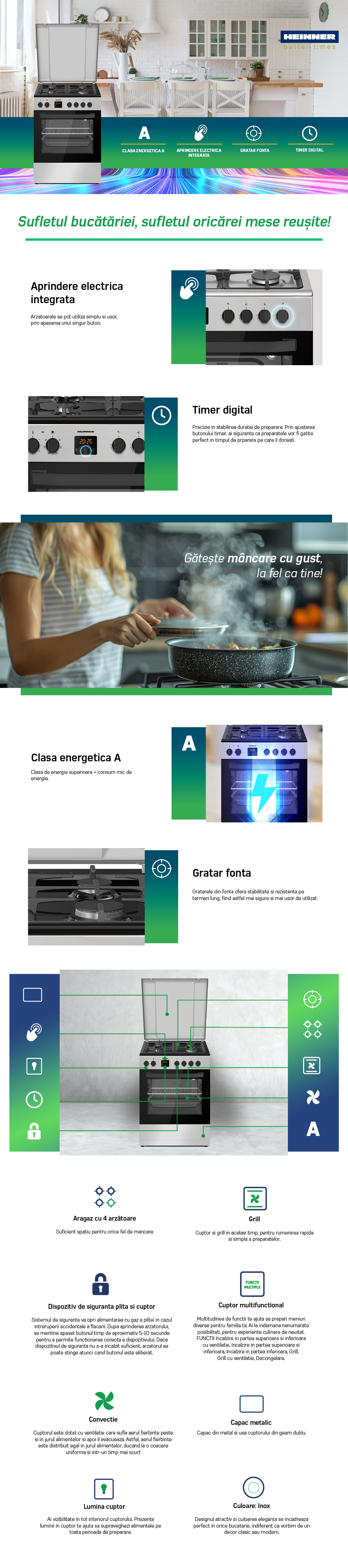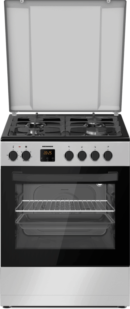 ARAGAZ MIXT HEINNER HFSC-S66FDC-BIX, 60X60CM, 4 ARZATOARE, SUPORT FONTA, CAPAC METALIC, APRINDERE ELECTRICA PLITA, DISPOZITIV DE SIGURANTA PLITA, CUPTOR ELECTRIC, 6 FUNCTII, TIMER DIGITAL, GRILL, VENTILATIE, LUMINA CUPTOR, USA CUPTOR CU GEAM DUBLU DETASABIL, DUZE GPL INCLUSE, TAVA SI GRATAR CROMAT, DIMENSIUNI ( LXAXI): 60x60x83 CM, CULOARE: INOX