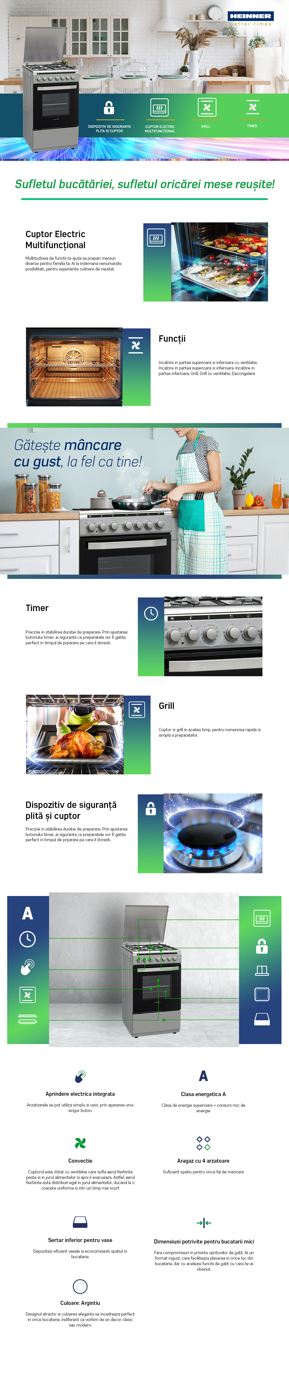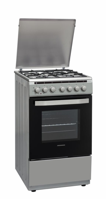 Aragaz Mixt Heinner HFSC-V60LITGC-SL, 50x60cm, 4 arzatoare, Suport metalic, Capac metalic, Aprindere electrica plita, Dispozitiv de siguranta plita, Cuptor electric, 6 functii, Timer, Grill, Ventilatie, Decongelare, Lumina cuptor, Usa cuptor cu geam dublu detasabil, Duze GPL incluse, Tava si gratar cromat, Dimensiuni ( LxAxI): 50x60x85 cm, Culoare: Argintiu
