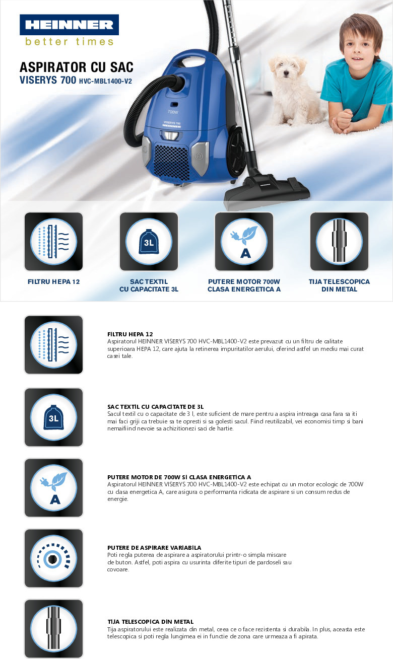 Aspirator cu sac Heinner HVC-MBL1400-V2, putere: 700W, putere de abrsorbtie: 170W, putree variabila, tija telescopica din metal, 1 perie de praf si accesoriu 2 in 1 pentru spatii ginsute, capacitate sac textil: 3L, filtru HEPA 12, retragere automata cablu de alimentare, lungime cablu: 5m, nivel de zgomot: 76dB