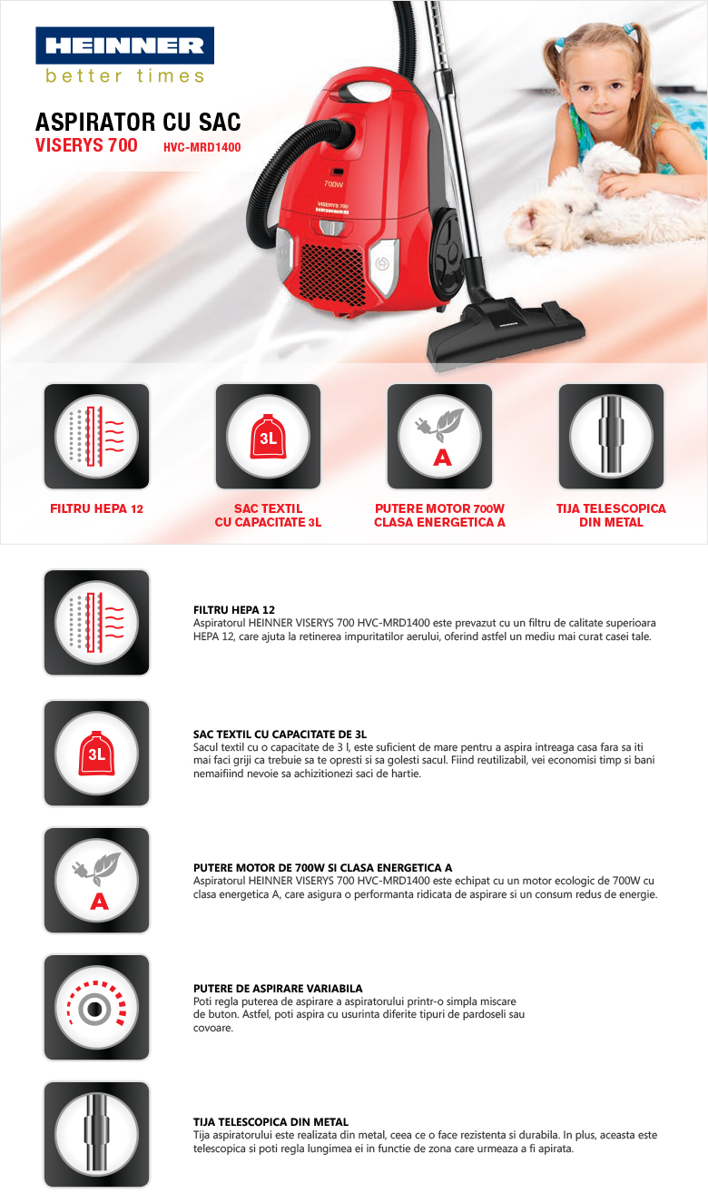 Aspirator cu sac Heinner HVC-MRD1400, putere: 700W, putere de aspirare: 170W, putere variabila, capacitate sac textil: 3L, filtru HEPA 12, tija telescopica din metal, 1 perie de praf si accesoriu 2 in 1 pentru spatii inguste, retragere automata cablu de alimentare, lungime cablu: 5m, culoare: rosu, nivel de zgomot: 76dB