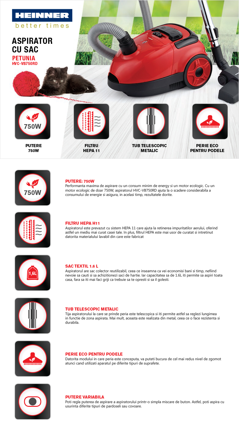 Aspirator cu sac Heinner HVC-VB750RD, putere: 750 W, putere de aspirare > 180 W, filtru HEPA H11, tub telescopic metalic, perie ECO pentru podele, capacitatea sacului pentru praf: 1,6 L, control variabil al puterii, accesoriu pentru spații înguste și perie pentru canapele, retragere automată a cablului, lungimea cablului de alimentare: 4.5 m, nivel de zgomot: 78 dB