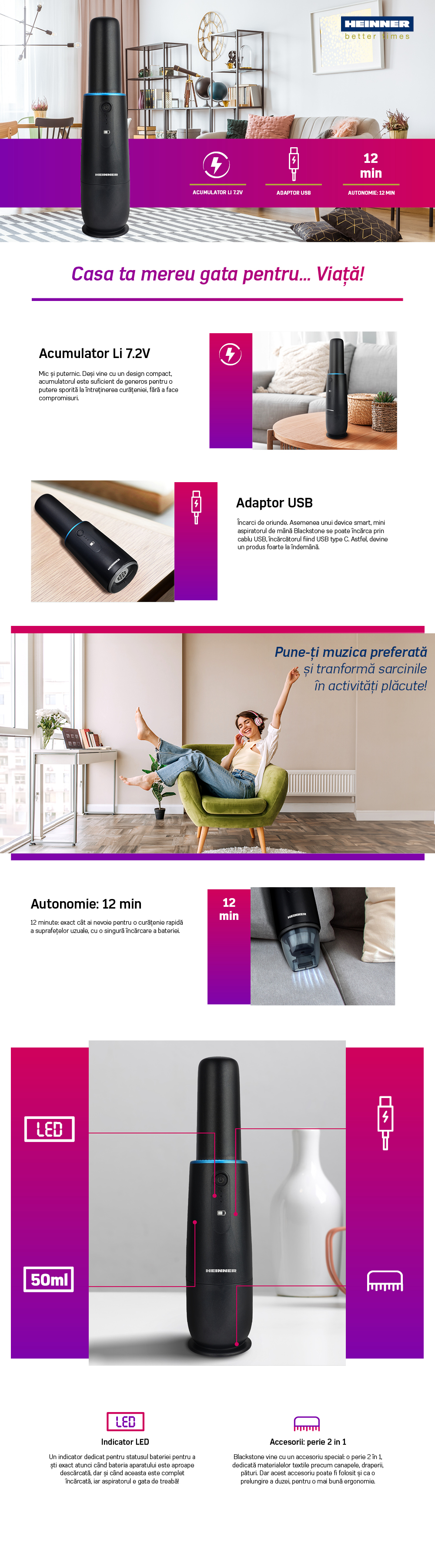Aspirator de mana Heinner HHVC-D7.2BK, acumulator Li 7.2V, putere absorbtie: 5Kpa, putere: 70W, indicator LED, capacitate recipient prafL 0.05L, autonomie: 12 min, durata incarcare: 3 ore, adaptor USB, accesorii: perie 2 in 1, negru