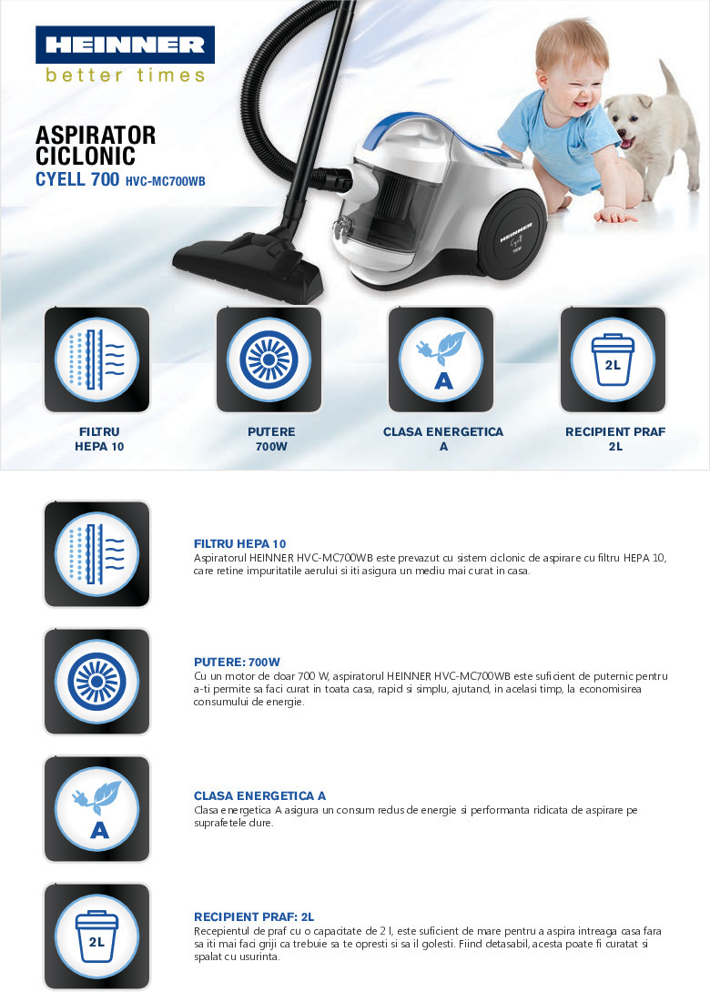 Aspirator fara sac Heinner Cyell HVC-MC700WB, sistem ciclonic, filtru HEPA 10, putere: 700W, putere de aspirare: >140W, capacitate: 2L, tija din plastic, accesorii pentru spatii inguste, retragere automata a cablului de alimentare, lungime cablu: 5m, nivel de zgomot: 76dB