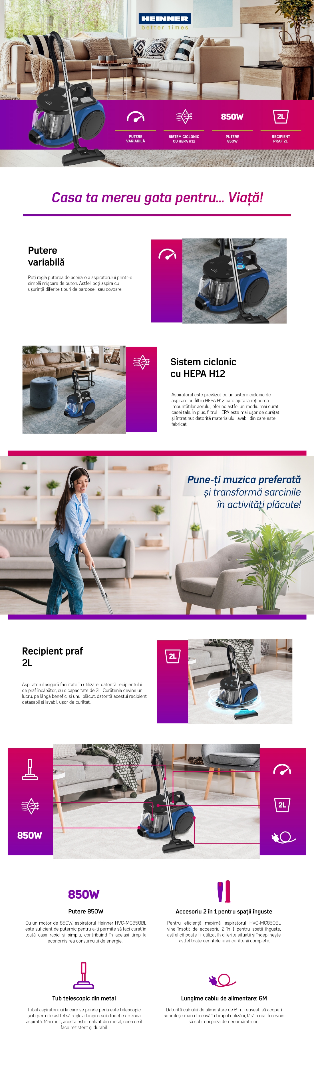 ASPIRATOR FARA SAC HEINNER CycloClean HVC-MC850BL, 850W, PUTERE ABSORBTIE: 170W, FILTRU HEPA H12, PUTERE VARIABILA, RECIPIENT PRAF: 2L, TUB TELESCOPIC METALIC, CULOARE: ALBASTRU&NEGRU