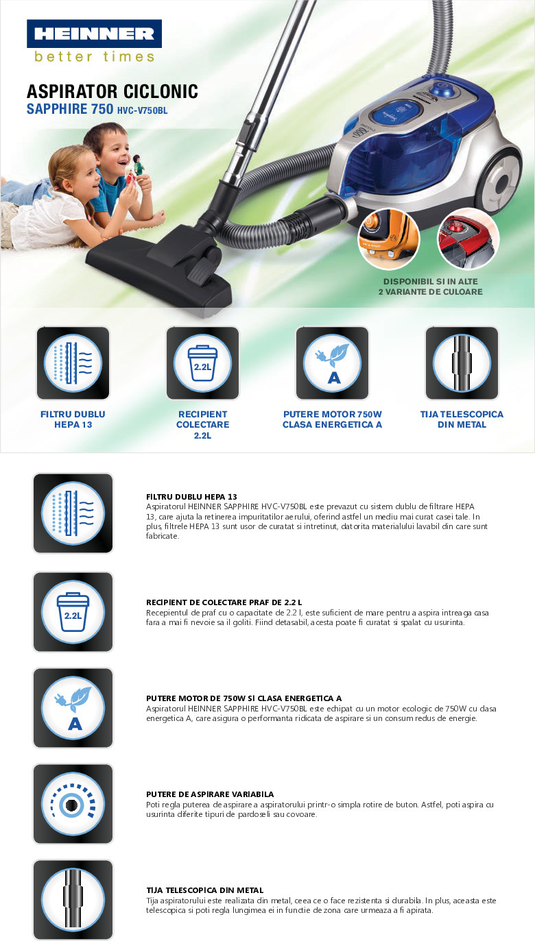 Aspirator fara sac Heinner HVC-V750BL, putere: 750W, putere de absorbtie: >160W, sistem ciclonic cu filtru HEPA 13 dublu, control de viteza variabil, tub de metal telescopic, capacitate recipient praf: 2.2L, accesoriu 2 in 1 pentru spatii inguste, 1 perie de praf, retragere automata cablu de alimentare, nivel de zgomot: 4.5m, culoare: albastru