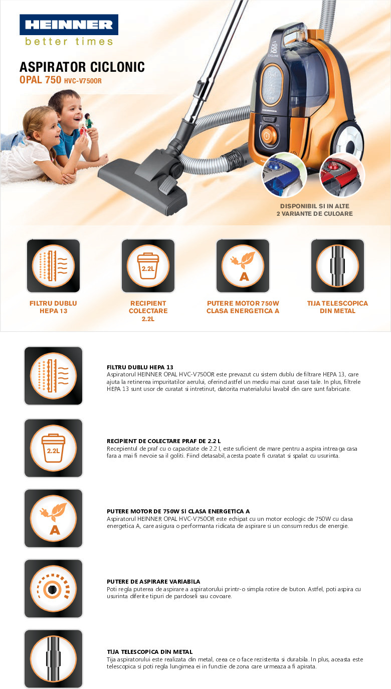 Aspirator fara sac Heinner HVC-V750OR, putere: 750W, putere de absorbtie: >160W, sistem ciclonic cu filtru HEPA dublu, control de viteza variabil, tub de metal telescopic, capacitate recipient praf: 2.2L, accesoriu 2 in 1 pentru spatii inguste, 1 perie de praf, retragere automata cablu de alimentare, nivel de zgomot: 4.5m, culoare: portocaliu