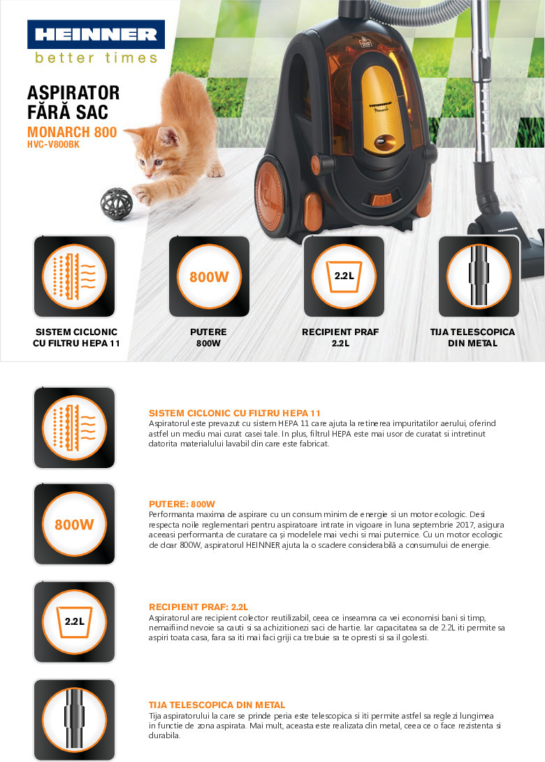 Aspirator fara sac Heinner Monarch 800 HVC-V800BK, sistem ciclonic, filtru HEPA 11, 800W putere, putere absorbtie: >180W, viteza variabila, capacitate recipient praf: 2.2L, tub telescopic metal, accesoriu 2 in 1 pentru spatii inguste, perie canapele, negru/orange