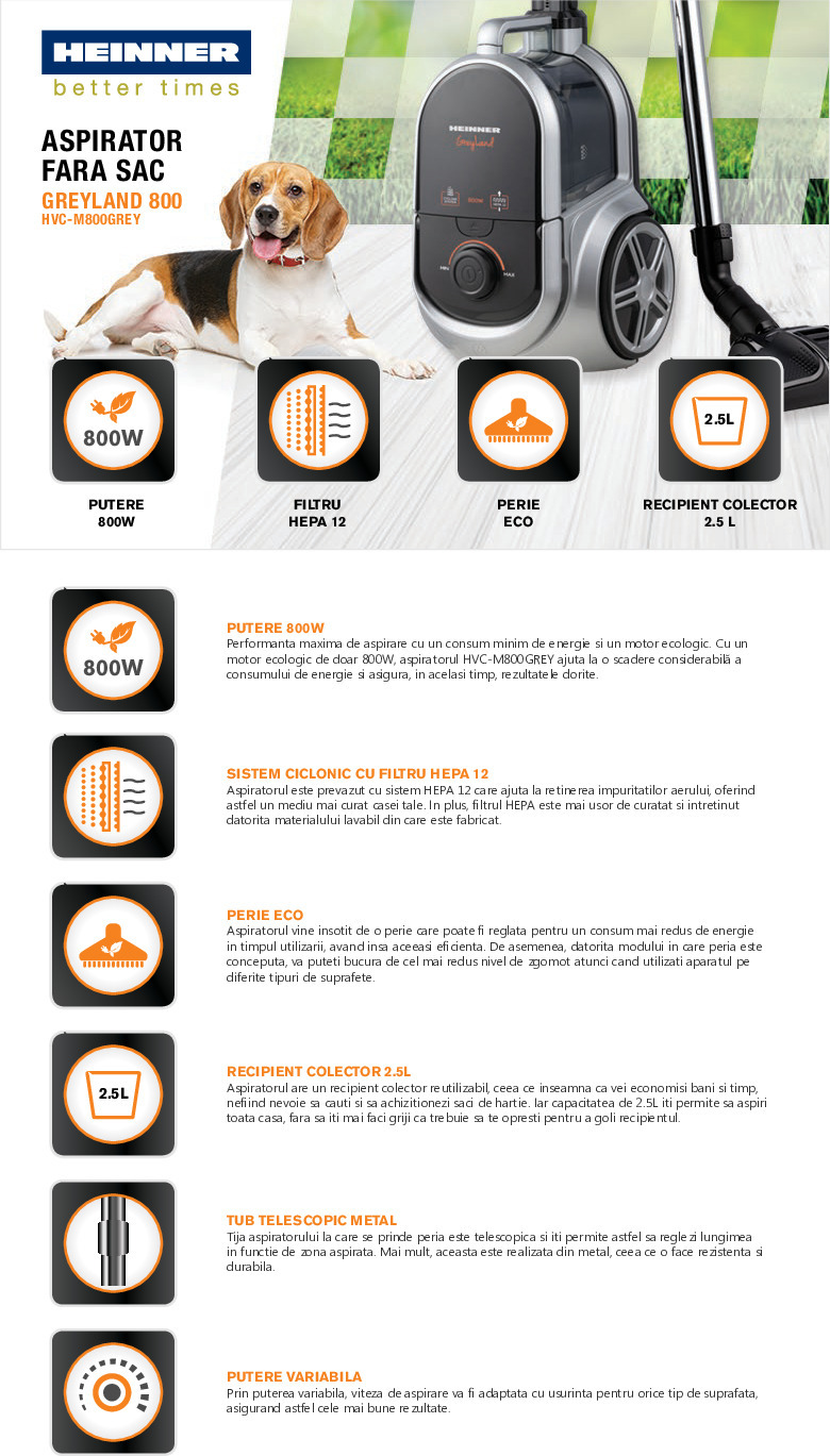 Aspirator Heinner GreyLand HVC-M800GREY, sistem ciclonic, putere: 800W, putere absorbtie: 160W, filtru HEPA 12, capacitate recipient praf: 2.5L, tub telescopic din metal, putere variabila, gri