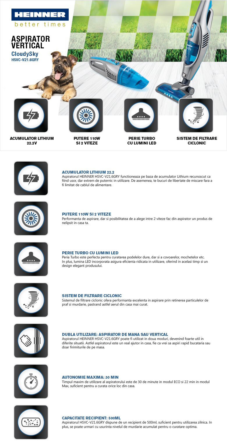 Aspirator vertical Heinner CloudySky HSVC-V21.6GRY, sistem de filtrare ciclonica, dubla utilizare: aspirator de mana si vertical, acumulator cu litiu: 22.2V, putereL 110W si 2 viteze (ECO, Max), putere de aspirare max: 8kPa, capacitate recipient: 0.5L, perie electrica cu lumini LED, accesorii: perie canapele, perie pentru spatii inguste, suport incarcare, duarata incarcare: 5 ore, autonomie in mod Max: >22min, autonomie in mod ECO: 30 min, nivel zgomot: >72dB