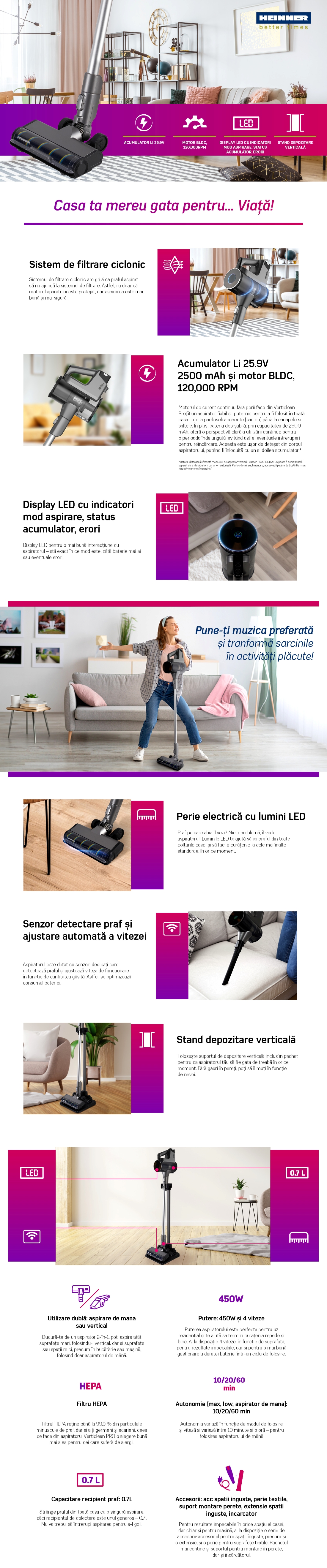Aspirator vertical Heinner VertiGo HSVC-MBD25.9S, sistem filtrare ciclonic, acumulator Li: 25.9V, utilizare dubla: aspirare de mana sau vertical, motor BLDC, 120,000RPM, putere: 450W si 3 viteze, putere absorbtie: 140W, autonomie (max, low): 10/20 min, display LED cu indicatori mod aspirare, status acumulator, erori, senzor detectare praf si ajustare viteza de aspirare, 4 moduri de aspirare, perie electrica cu lumini LED, capacitate recipient praf: 0.7L, timp incarcare: 4-6 ore, filtru HEPA, accesorii: acc spatii inguste, perie textile, suport montare perete, incarcator, suport depozitare vertical, extensie spatii inguste, nivel zgomot: 84dB, silver