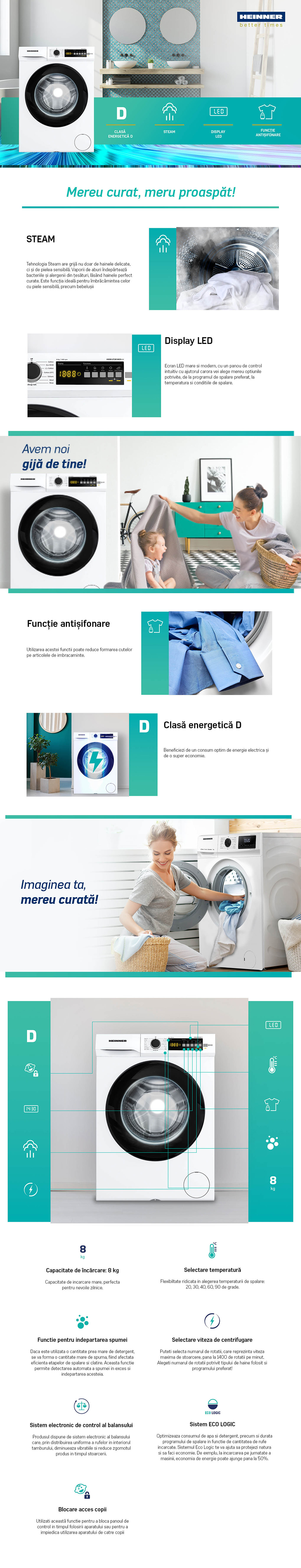 Automatic washing machine Heinner HWM-VT2814KD+++, Loading capacity 8kg, Spin speed 1400rpm, Energy efficiency class D, 15 programs, Digital display, Quick program 15 min, Short 60 min,Steam, Allergy safe program, Delay end, Easy ironing function, Eco logic system, Foam detection system, Balance control system, Child lock, Dimensions (WxDxH): 59.7X55.7X84.5 cm, Color: White