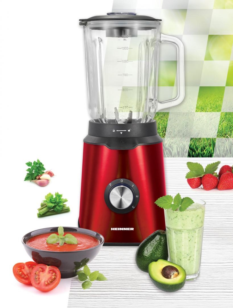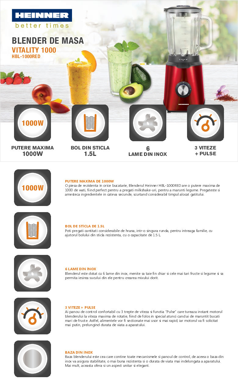 Blender de masa Heinner Vitality 1000 HBL-1000RED, putere: 1000W, capacitate bol sticla; 1.5L, 3 viteze + Pulse, 6 lame din inox, indicator luminos, protectie supraincalzire, sistem de siguranta, nivel de zgomot: 80dB, rosu spray