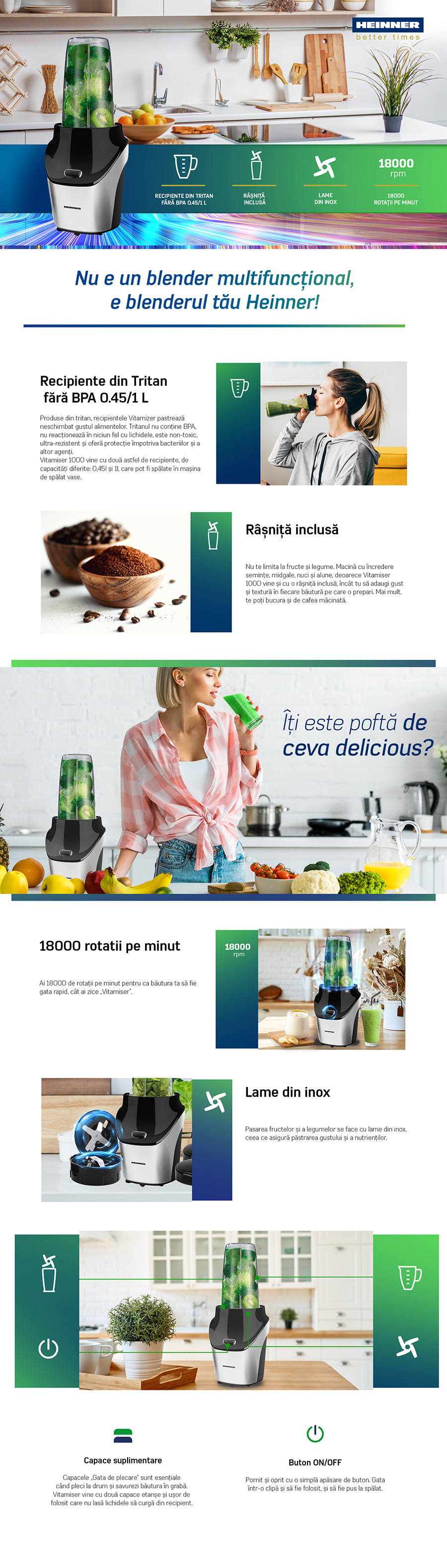 Blender sport Heinner HSB-T1000SS, 1000W, 18000RPM, recipient Tritan fara BPA 0.45L, recip
