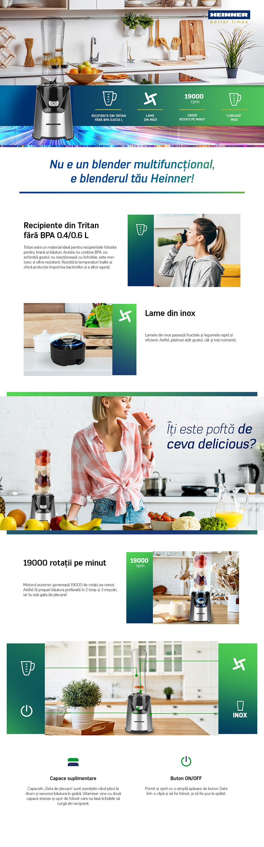Blender sport Heinner HSB-T400SS, 400W, 19000RPM, recipient Tritan fara BPA 600ml, recipie