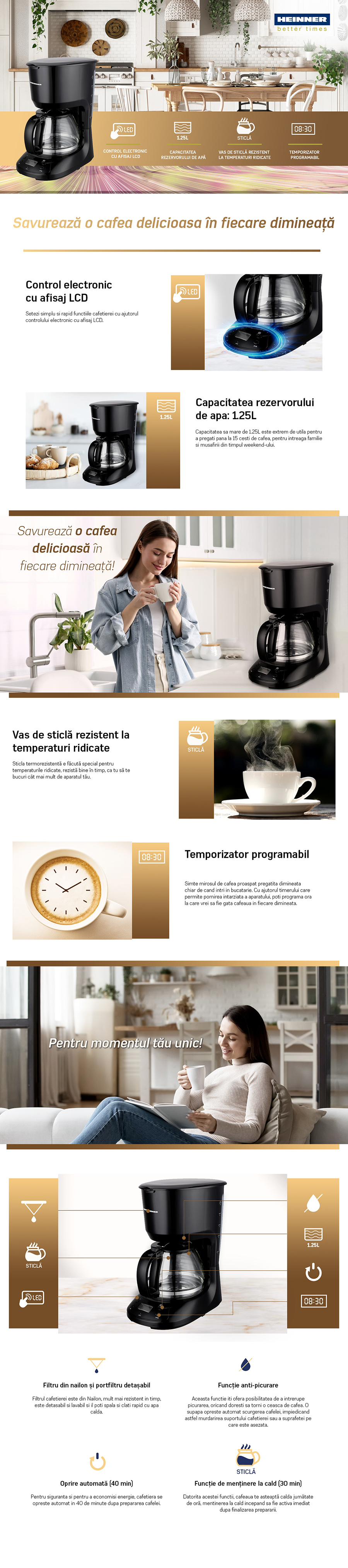 CAFETIERA DIGITALA HEINNER BLACK CHATT HCM-D750GCBK, 750W, 1.25L CAPACITATE, CONTROL ELECTRONIC, DISPLAY LCD, FILTRU SI PORTFILTRU DETASABIL, FILTRU NYLON, CANA STICLA REZISTENTA LA TEMPERATURI RIDICATE, TIMER PROGRAMABIL, PROTECTIE IMPORTIVA FUNCTIONARII FARA APA, FUNCTIE ANTIPICURARE, OPRIRE AUTOMATA 40 MIN, FUNCTIE MENTINERE CALD 30 MIN, NEGRU