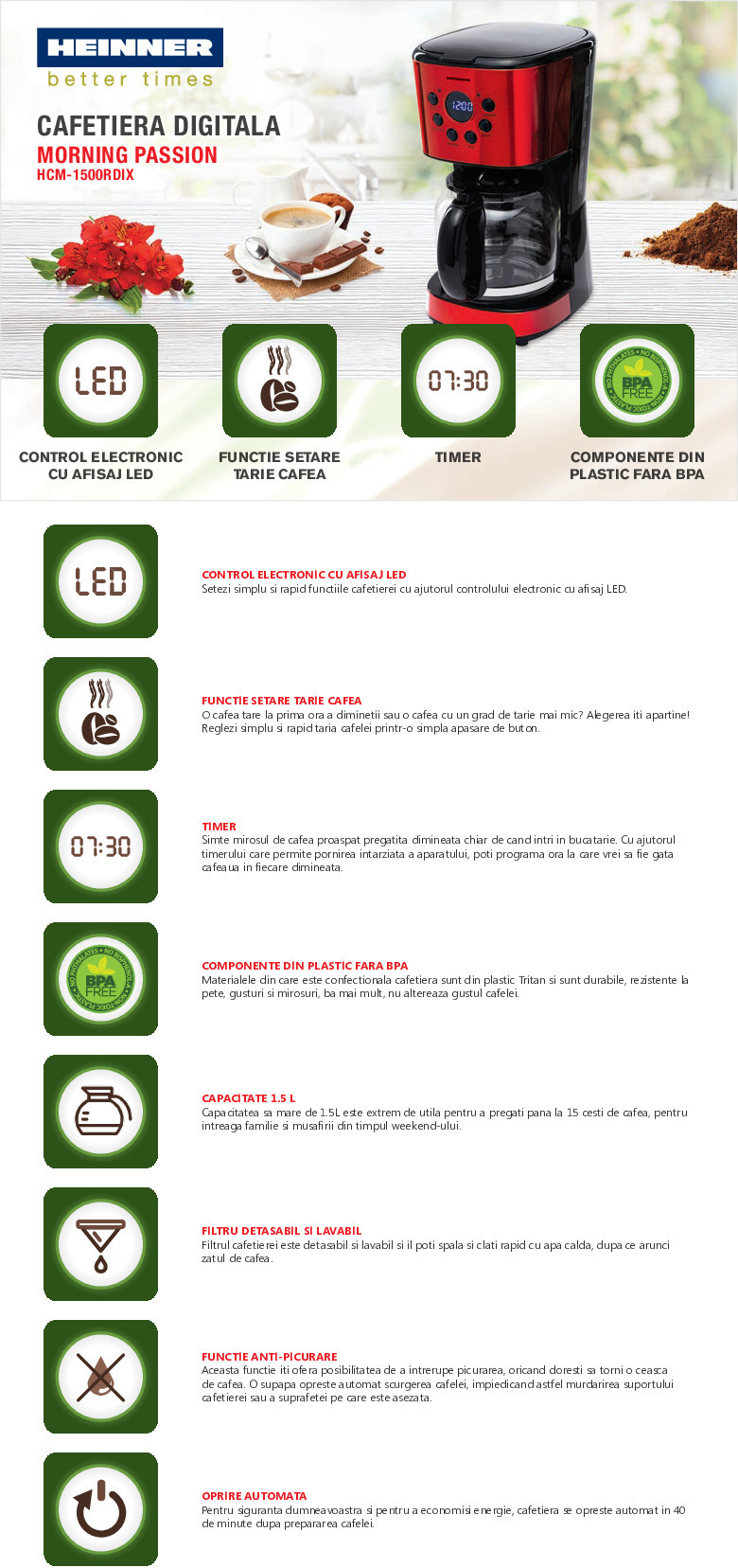 Cafetiera digitala Heinner HCM-1500RDIX, display LED, functie setare tarie cafea, timer programabil, capacitate: 1.5L, putere; 900W, plastic fara BPA, cana din sticla, filtru detasabil si lavabil, functie anti- picurare, auto-oprire dupa 40 min, protectie impotriva actionarii fara apa, inox, rosu