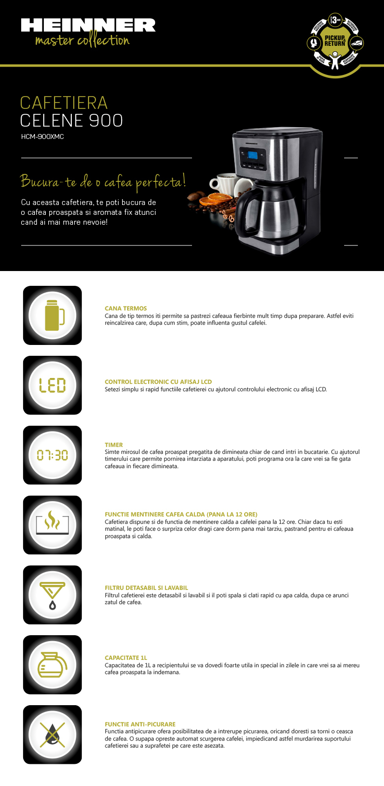 Cafetiera Heinner Celene 900 HCM-900XMC, putere: 900W, control electronic, timer programabil, afisaj LCD, cana termos, filtru detasabil si lavabil, functie de mentinere a temperaturii, functie anti-picurare, capacitate: 1L, indicator pentru nivelul apei, ornamente din inox
