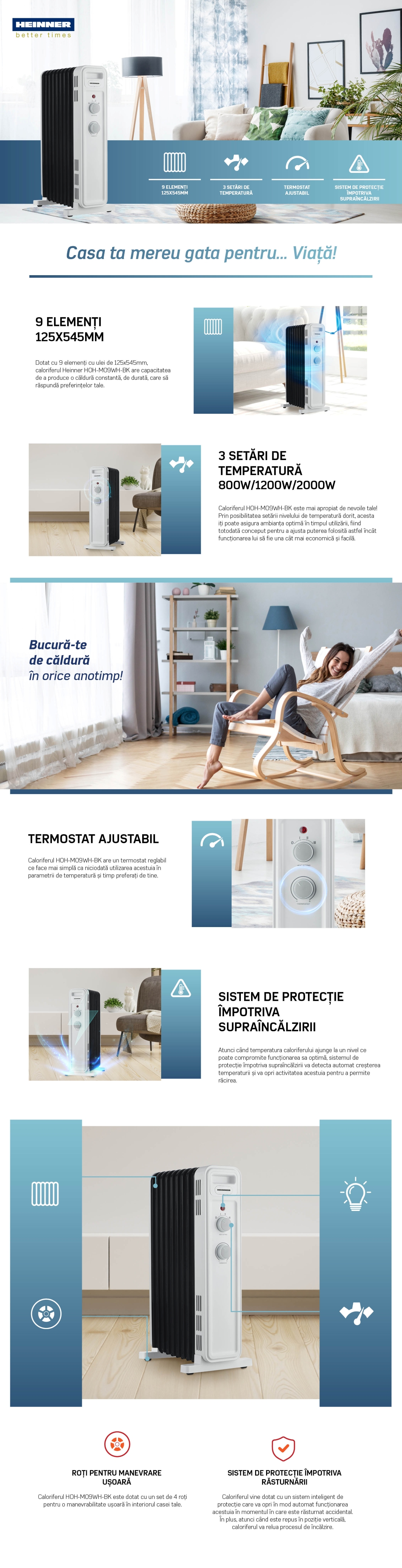 CALORIFER CU ULEI HEINNER HOH-M09WH-BK, 9 ELEMENTI: 125X545 MM, 3 SETARI DE TEMPERATURA: 800W/ 1200W/ 2000W, TERMOSTAT AJUSTABIL, PROTECTIE SUPRAINCALZIRE, PROTECTIE IN CAZ DE RASTURNARE, ROTI, SPATIU DEPOZITARE CABLU, CULOARE: ALB CU NEGRU